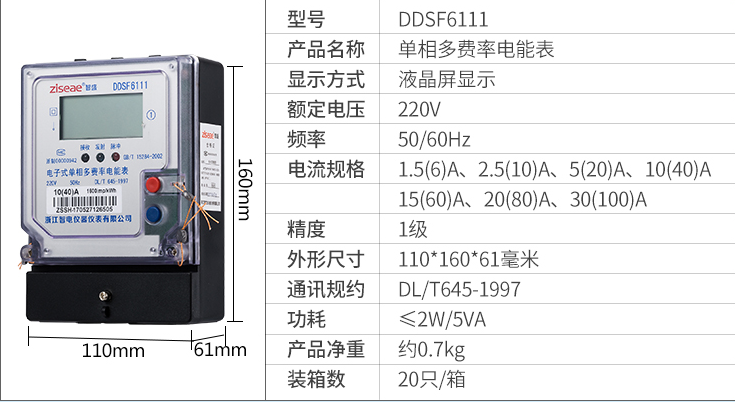 DDSF6111單相電子式多費率電能表,采用單片機處理系統設計而成,具有電路簡單、可靠性高、成本低等優點。該產品軟件、硬件、結構設計技術先進,計量精度高,結合單片機資源,實現電能分時計量,具有紅外及RS-485通信功能,抗干擾、防攻擊性能好,工作溫度范圍寬,能長期穩定可靠工作。該產品各項性能指標符合國家GB/T 17215-20021級和2級靜止式交流有功電能表》GB/T 15284-2002《復費率(分時)電能表特殊要求》、DL/T 645-1997《多功能電能表通信規約》等標準的技術要求。